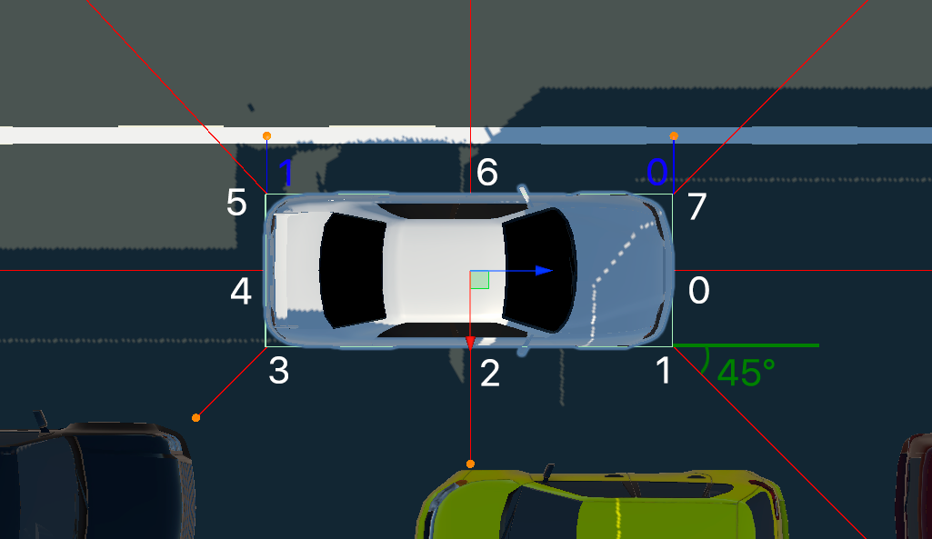На автомобиле расположены 8 парктроников, а также 2 датчика разметки. Для упрощения задачи коллайдер автомобиля представляет собой параллелепипед размерами (1,811328 м в ширину, 4,819343 м в длину и 1,191418 м в высоту).