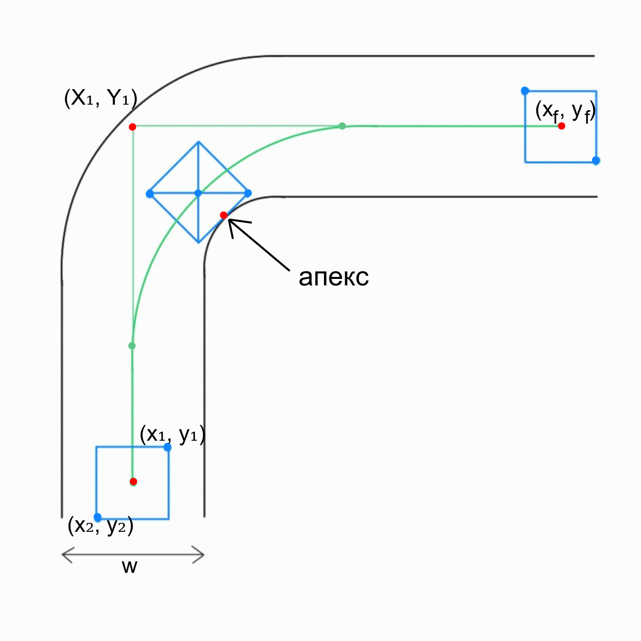 На прямых участках Петя старается ехать ровно по осевой линии трека, однако, приближаясь к поворотам, корректирует траекторию в сторону поворота. Эта траектория представляет собой дугу окружности, проходящую таким образом, чтобы при движении по ней автомобиль внешней стороной касался апекса (точки, ближайшей к внутреннему краю дороги).