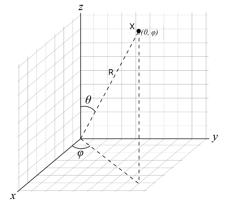По прошествии задержки пользовательский интерфейс начинает свое движение. Рассмотрим произвольный кадр \(f_j\). Пусть \(P=(x_{f_j}^{UI}, y_{f_j}^{UI}, z_{f_j}^{UI} )\in S\) — координаты центра пользовательского интерфейса, \(Q=(x_{f_j}^s, y_{f_j}^s, z_{f_j}^s )\in S\) — координаты пересечения взгляда со сферой. Тогда можно сопоставить точкам \(P\) и \(Q\) пары чисел \((\theta_P, \varphi_P )\) и \((\theta_Q, \varphi_Q )\). \(0°\leqslant\theta_X\leqslant180°\) для точки \(X\) вычисляется как угол между осью \(Oz\) и отрезком, соединяющим начало координат и точку \(X\), \(0°\leqslant\varphi_X<360°\) вычисляется как угол между осью \(Ox\) и проекцией отрезка, соединяющего начало координат с точкой \(X\), на плоскость \(Oxy\) (см. рис. 1.5).