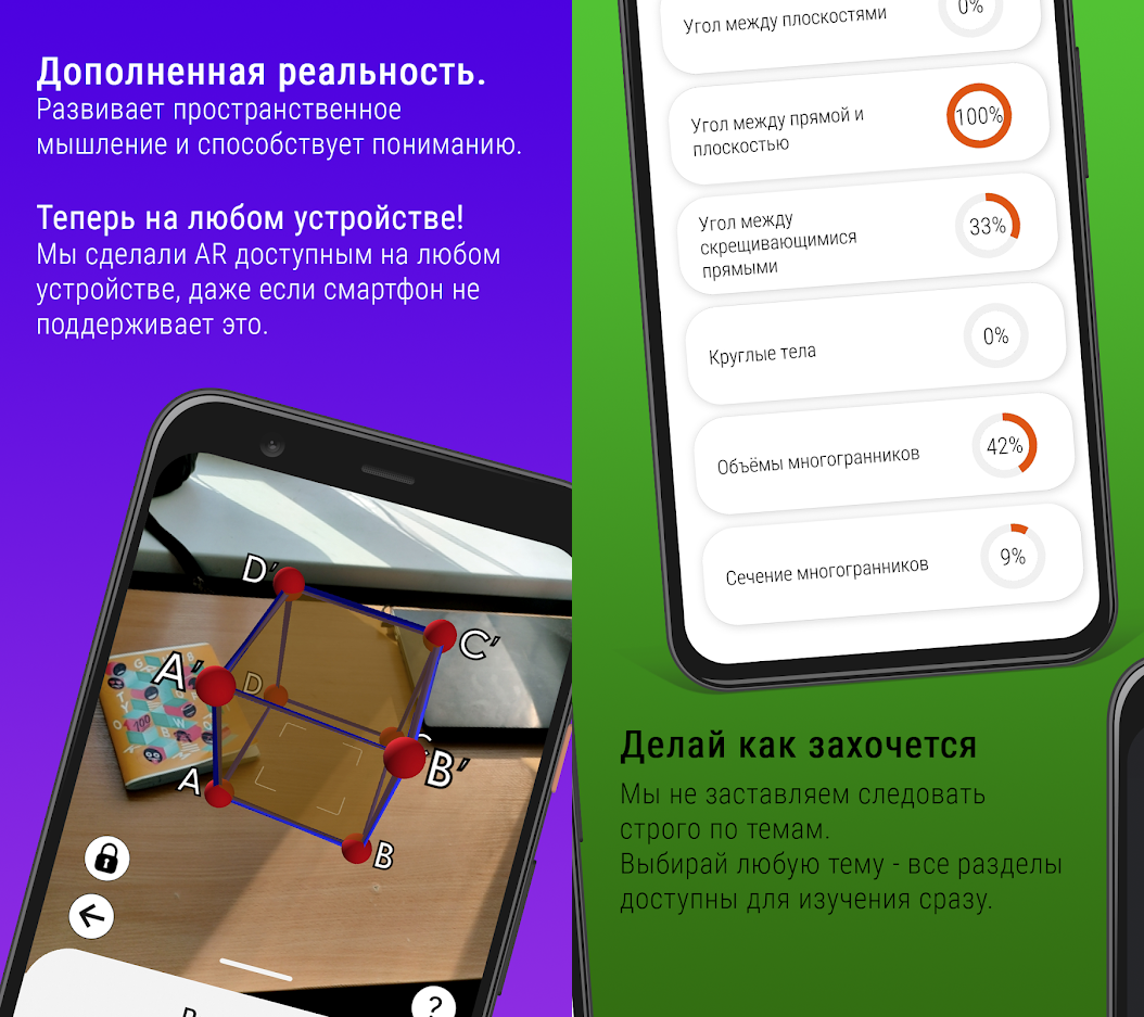 Компетенции, приобретенные в профиле, применяются выпускниками НТО в различных областях: поступление в профильные вузы, разработка игровых приложений виртуальной и дополненной реальности, участие в коммерческих проектах. Например, приложение Stearomtry (см. рис. 1.1) для подготовки к ЕГЭ по стереометрии с использованием AR, разработанное финалистом профиля НТО Дмитрием Мерзляковым, доступно в GooglePlay (https://play.google.com/store/apps/details?id=com.wizard.stearometry).