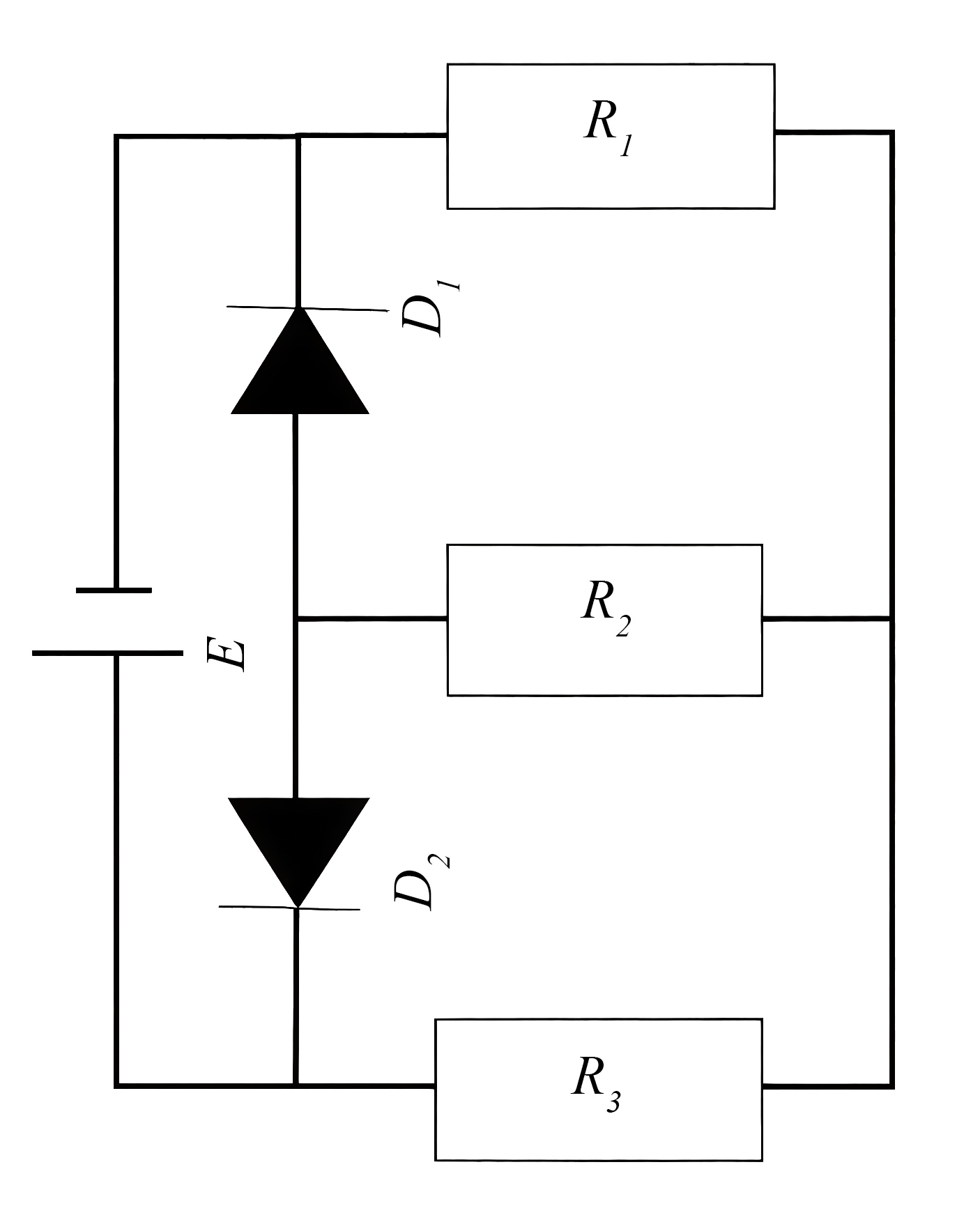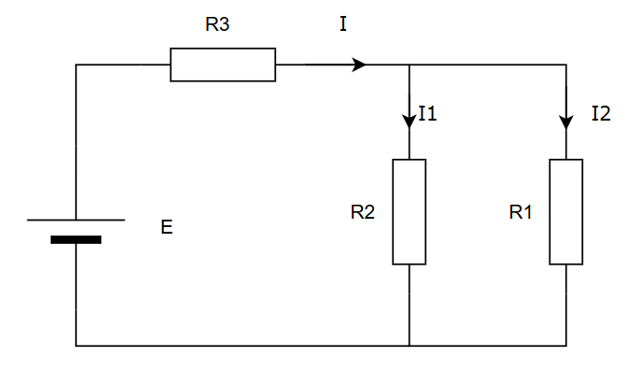 Система уравнений по законам Кирхгофа: \[I=I_1+I_2;\] \[E=R_1I_1+R_3I;\] \[E=R_2I_2+R_3I.\]