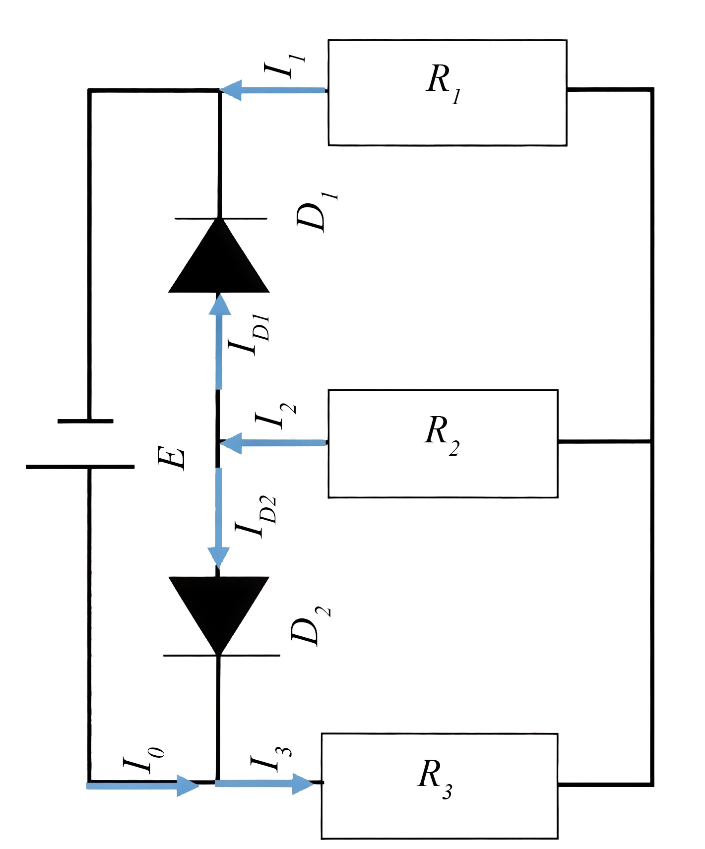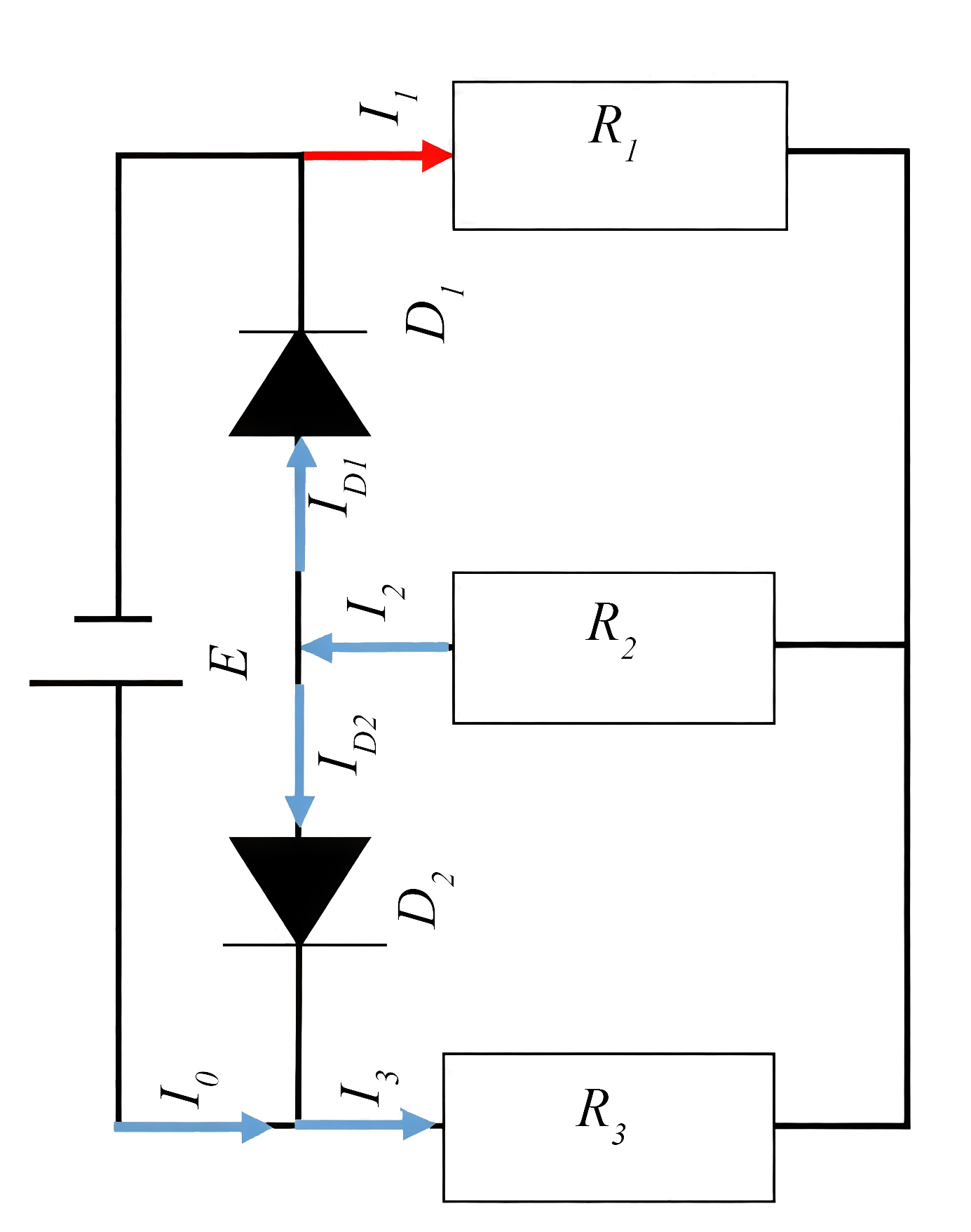 Запишем систему уравнений по законам Кирхгофа: \[\label{yg10-030301} I_0+I_{D2}=I_3 ;\]