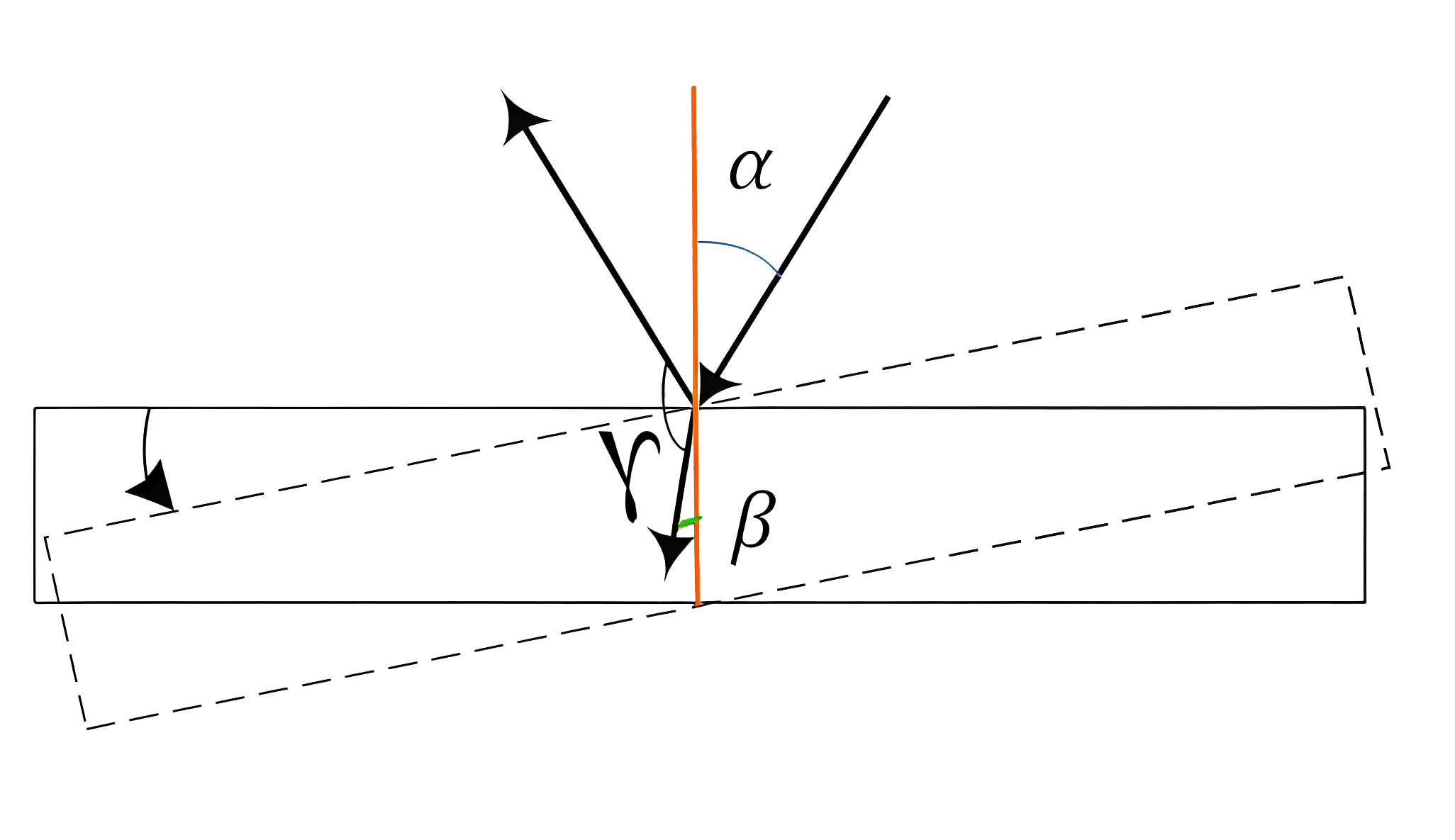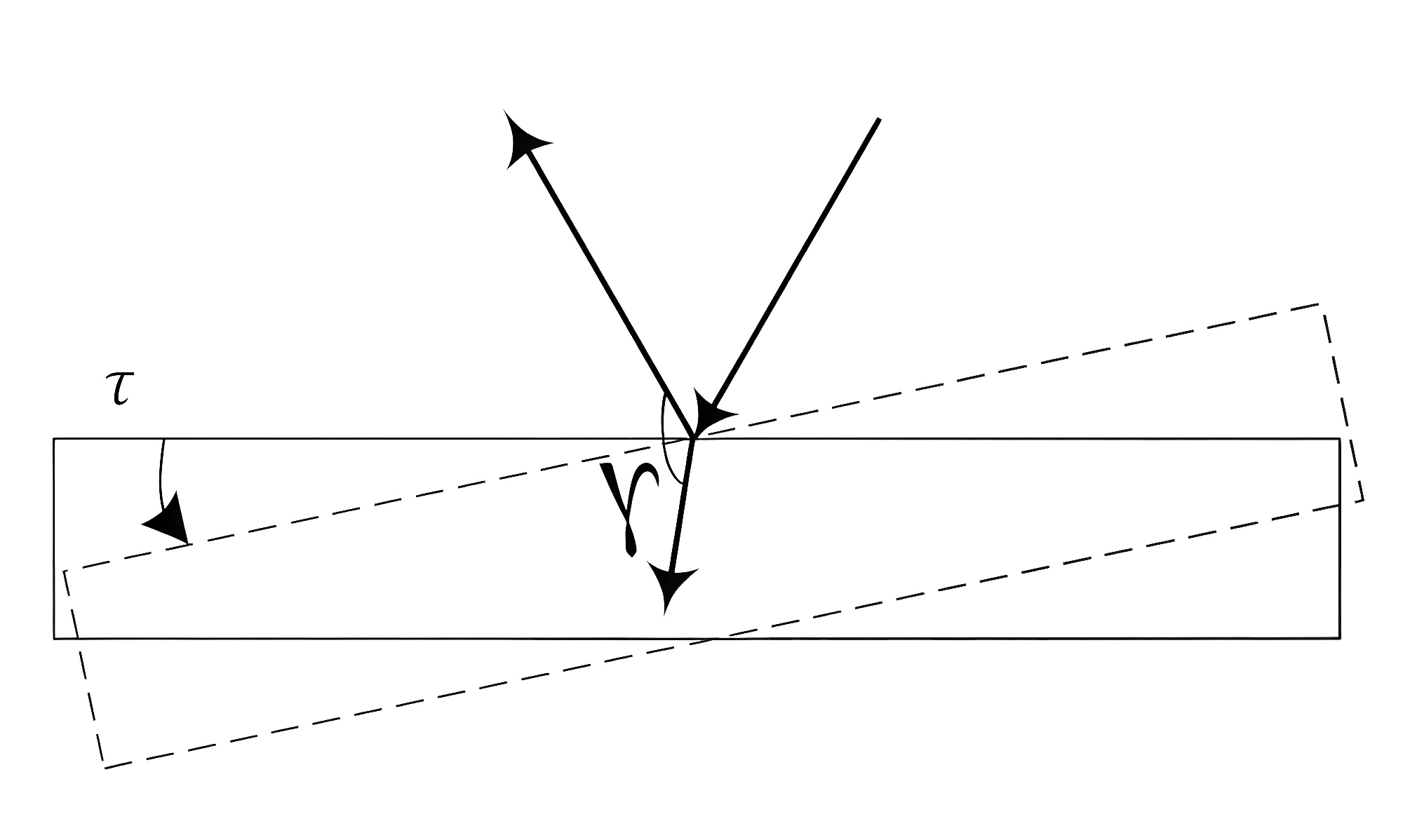Инженеры умного города проектируют прибор, измеряющий угол между падающим и отраженным лучом. При очередном испытании прибора использовали погруженную в воду плоскопараллельную пластинку из акрилового стекла. При горизонтальном положении пластинки прибор измерил угол в 60° 30\(^\prime\). Найдите изменение угла \(\gamma\), образованного отраженным и преломленным лучами (как показано на рис. 2.5), если повернуть пластинку на \(\tau=15°\). Показатели преломления воды (\(n_\text{в}\)) и акрилового стекла (\(n_\text{с}\)) равны 1,33 и 1,49 соответственно. Ответ представьте в виде 0° 0\(^\prime\), округлите до целого значения угловых минут.