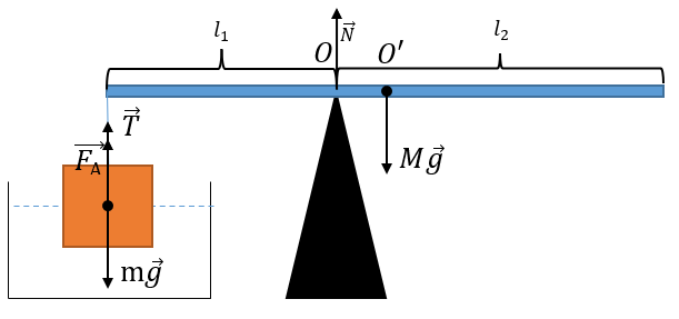 Центр масс коромысла точка \(O'\) находится на расстоянии \(\displaystyle\frac{l_1+l_2}2\) от краев и на \(\displaystyle\frac{l_2-l_1}2\) от точки подвеса куба.