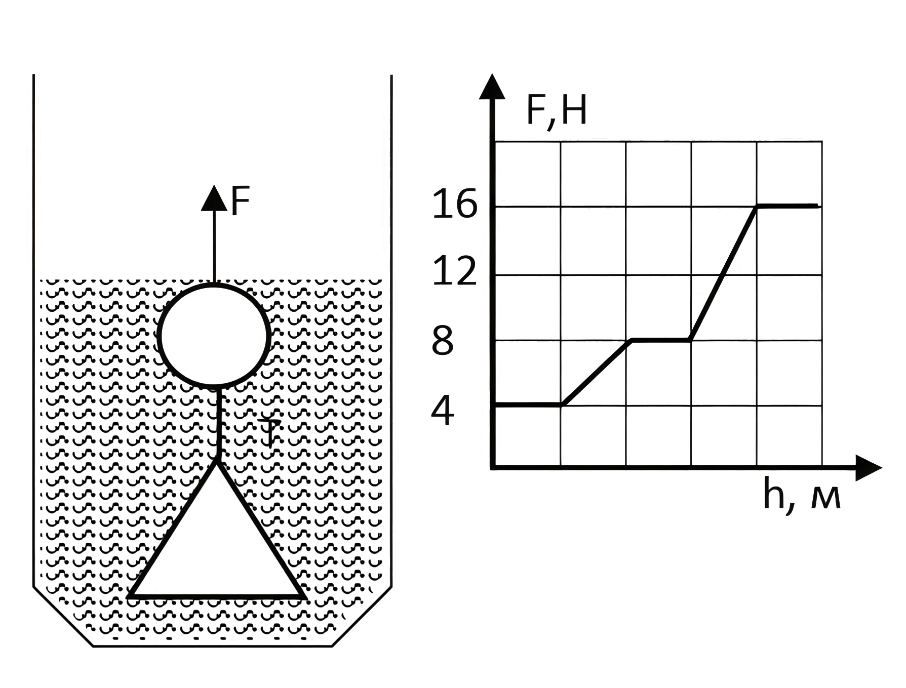 Зависимость показаний динамометра \(F\) от высоты подъема представлена на графике. Найдите натяжение нити \(T\) в момент времени, когда первый груз полностью выйдет из жидкости. Ответ округлите до десятых.