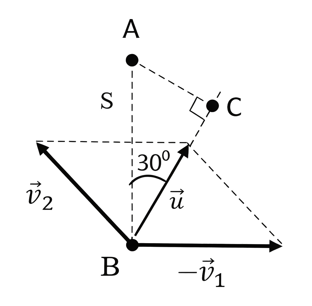Перейдем в систему отсчета, связанную с «коптером» 1. Ее начало отсчета поместим в точку \(A\). На рисунке скорость \(\vec{u}\) — это относительная скорость, которая по модулю равна \(v\) и направлена под углом \(30°\) к линии \(AB=S\). Найдем минимальное расстояние между «коптерами». Для этого опустим перпендикуляр \(AC\) из \(A\) на продолжение скорости \(u\). Из рис. 1.7 \(AC=S\cdot \sin{30}°=\dfrac S2\).