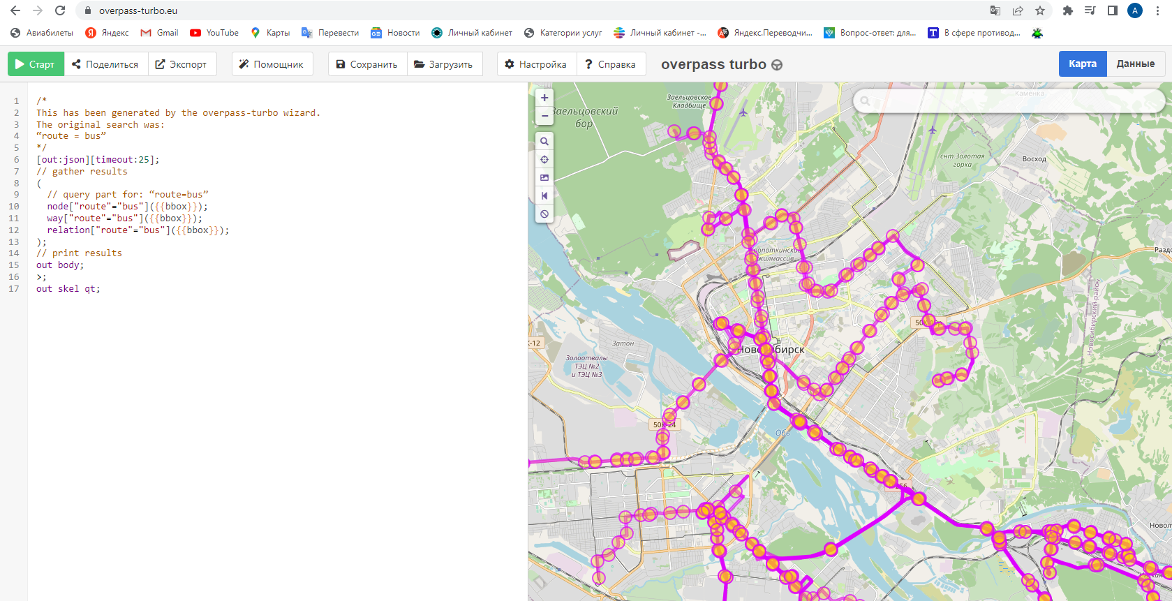Рис. 1.1.При помощи сервиса Overpass-turbo составляем соответствующие запросы и находим маршруты общественного транспорта в Новосибирске — рис. 1.2.
