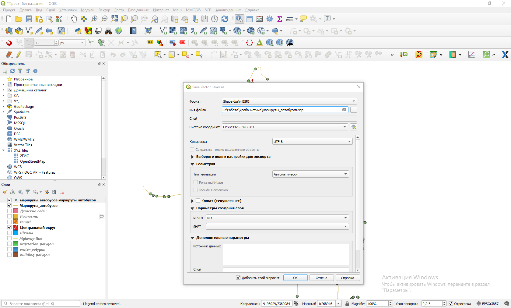 Рис. 1.6.Полученные единичные линии сохраним из временного слоя в постоянный с проекцией EPSG:3857 — рис. 1.7.