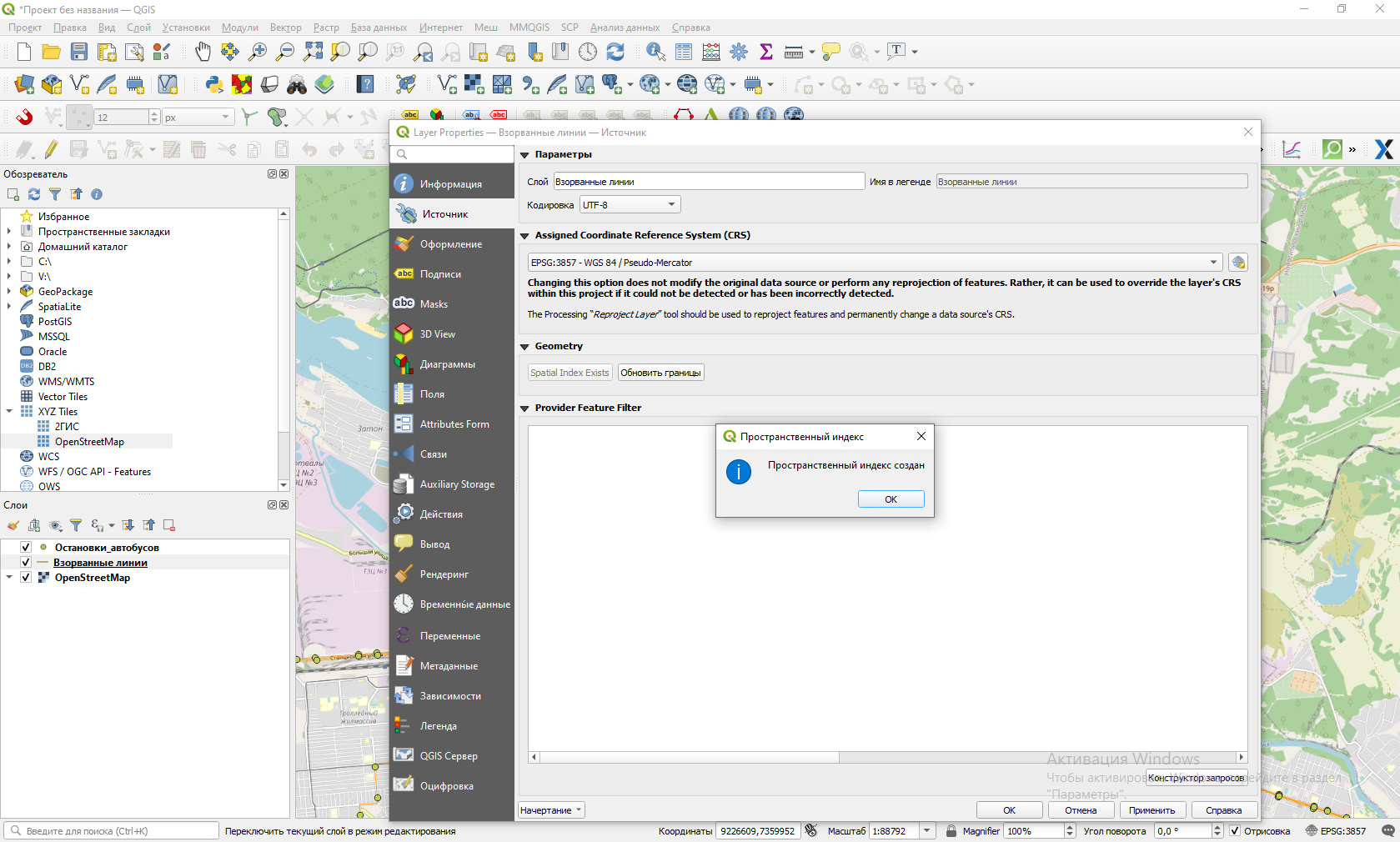 Рис. 1.7.Для ускорения пространственных расчетов у слоя «Взорванные линии» создадим пространственный индекс — рис. 1.8.