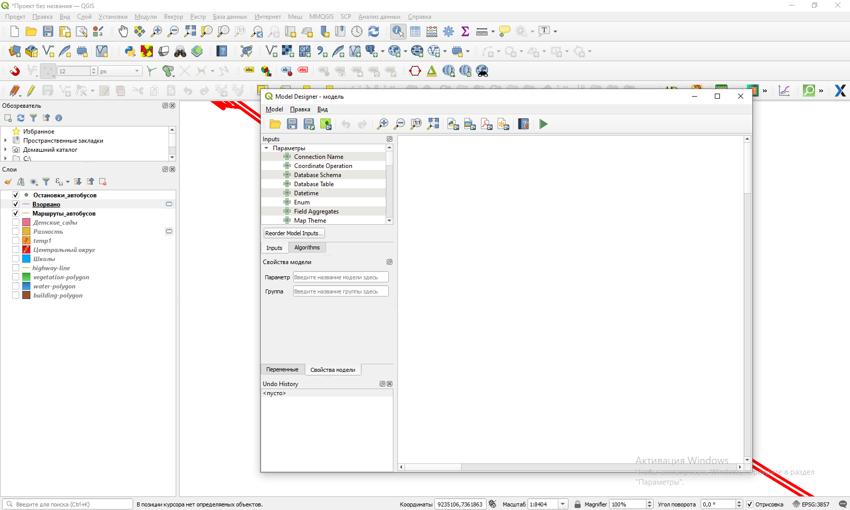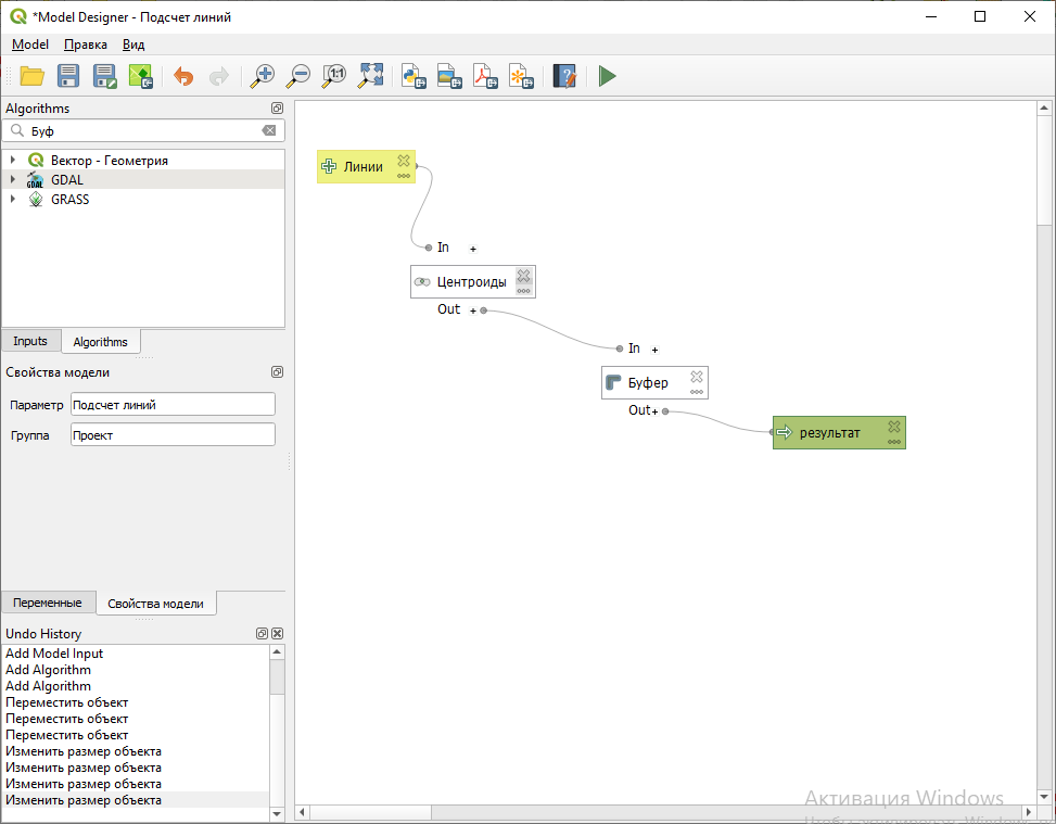 Рис. 1.9.Создадим графическую модель, которая будет находить центроиды линий и создавать вокруг них буферные зоны — рис. 1.10.