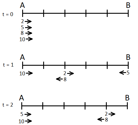 На рис. 4.2 приведено положение джентльменов из примеров в моменты времени 0, 1 и 2. Джентльмены обозначены своими скоростями. Стрелками обозначены направления их движения в соответствующий момент. Перечислим и пронумеруем в порядке возрастания моменты попарных приветствий этих джентльменов до момента времени 2 включительно. Если два и более приветствия происходят одновременно, неважно какое из них конкретно имеет номер \(k\), главное, что они происходят в один и тот же определенный момент времени.