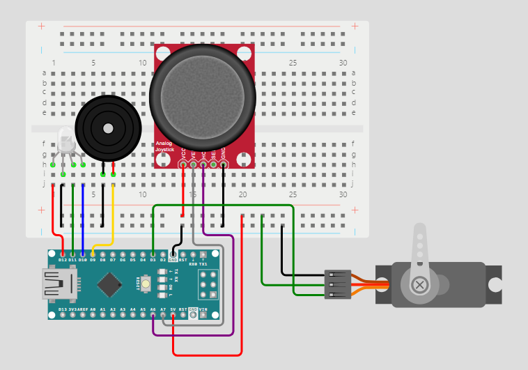 Дана схема, состоящая из контроллера Arduino Nano, сервомотора, джойстика, RGB-светодиода и зуммера. Схема по условию должна работать следующим образом: