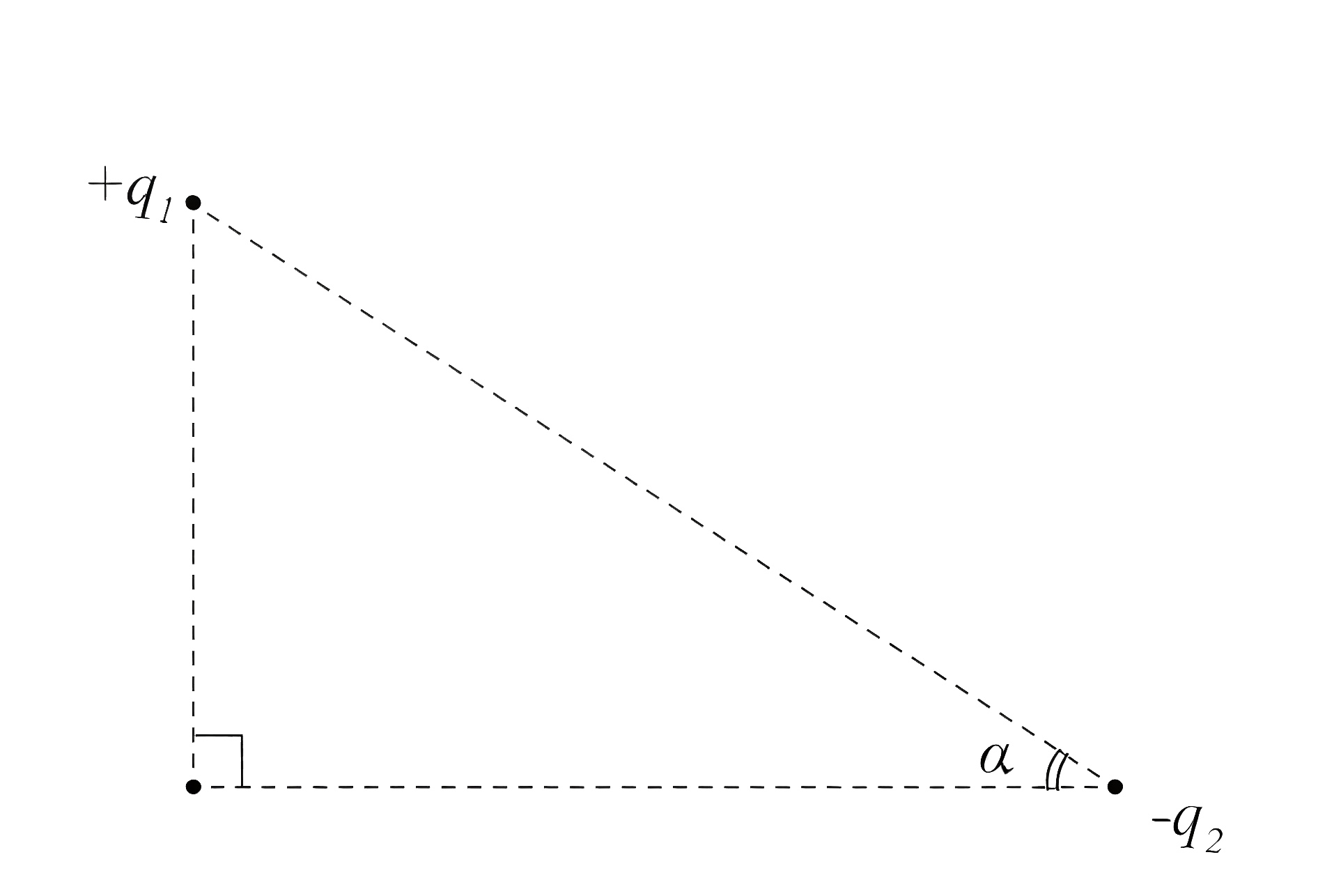 Точечные заряды \(+q_1\) и \(-q_2\) поместили в вершины прямоугольного треугольника, лежащих на его гипотенузе. Заряд \(-q_2\) находится в вершине треугольника, угол которого равен \(\alpha = 30°\). При каком отношении модулей зарядов \(q_2/q_1\) напряженность поля в третьей вершине треугольника будет направлена параллельно гипотенузе?