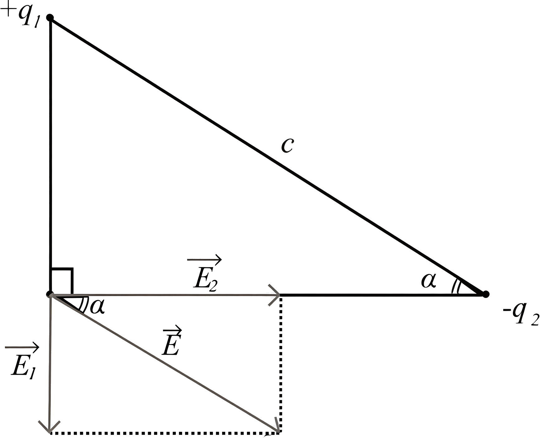 Обозначим: \(c\) — гипотенуза прямоугольного треугольника. Поле, создаваемое зарядом \(+q_1\), в вершине прямого угла \[E_1 = kq_1/(c \sin\alpha)^2.\]