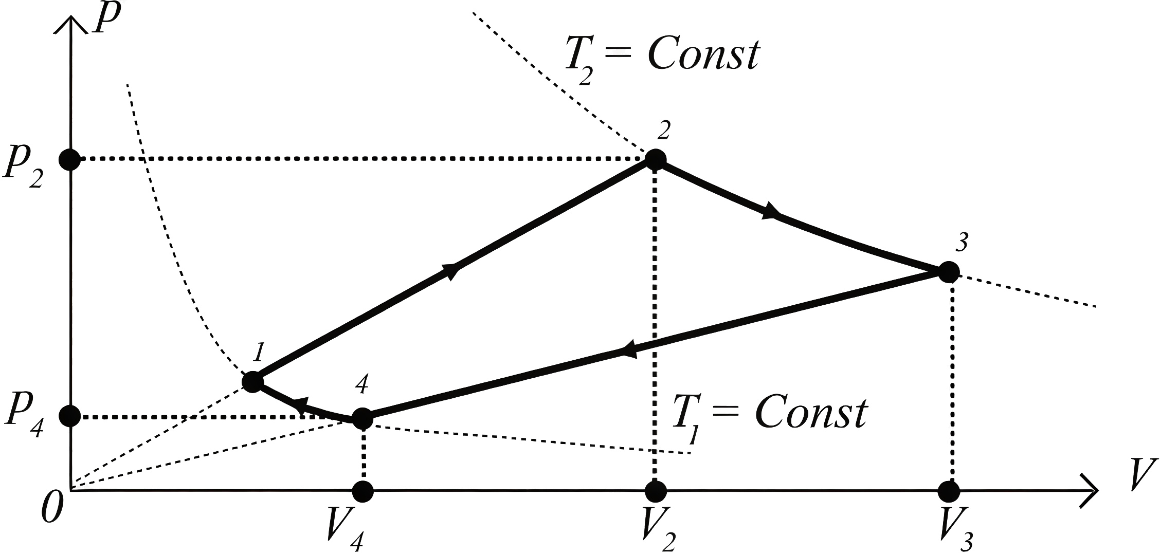 Так как на участке \(3 \rightarrow 4\) давление пропорционально объему, то \[p_3/p_4 = V_3/V_4 \rightarrow p_3 = p_4V_3/V_4 = p_{\text{min}}V_{\text{max}}/V_4.\]
