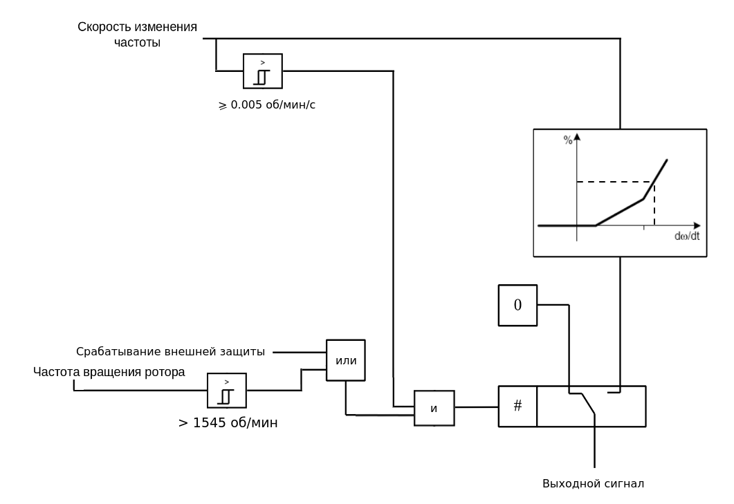 Дифференциатор предназначен для обеспечения защиты турбины при сбросах нагрузки и наличии положительной скорости изменения частоты вращения ротора турбины. Он включается при наличии ускорения вращения турбины и превышения максимально допустимой скорости ее вращения и действует в сторону уменьшения вращения. Выходной сигнал дифференциатора формируется в зависимости от значения скорости изменения частоты вращения. Зависимость представляет собой кусочно-линейную функцию.