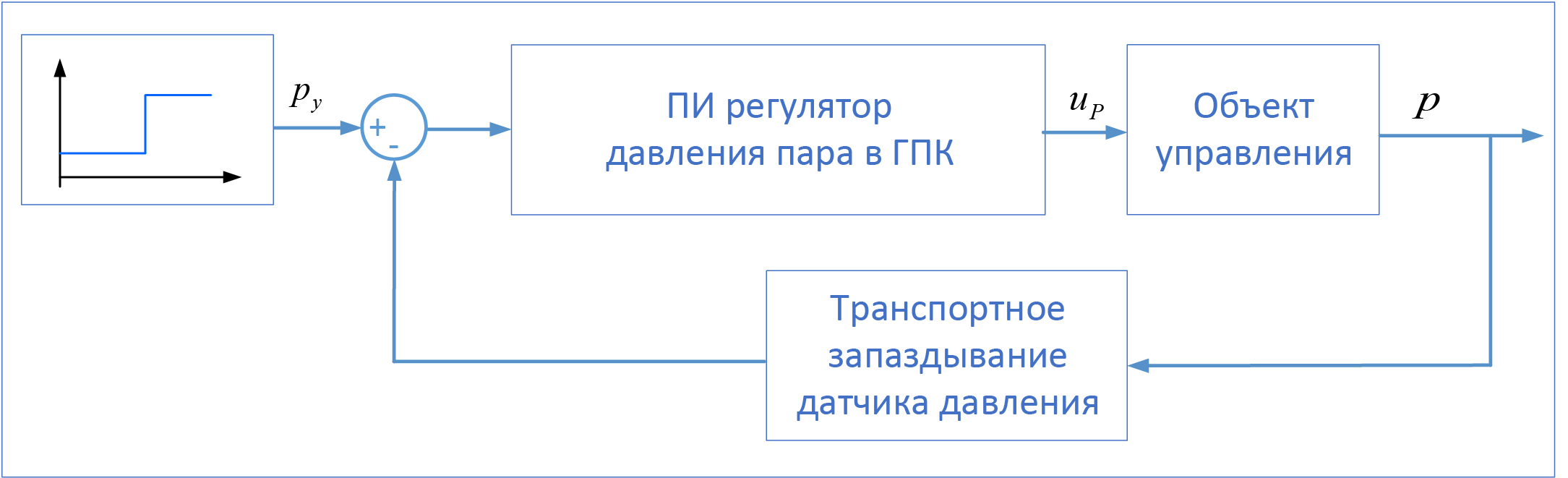 Уравнение регулятора давления пара в ГПК можно представить в виде: \[(p_y-p)\cdot K_p+ K_i\int_0^t (p_y-p)dt=u_p,\] где