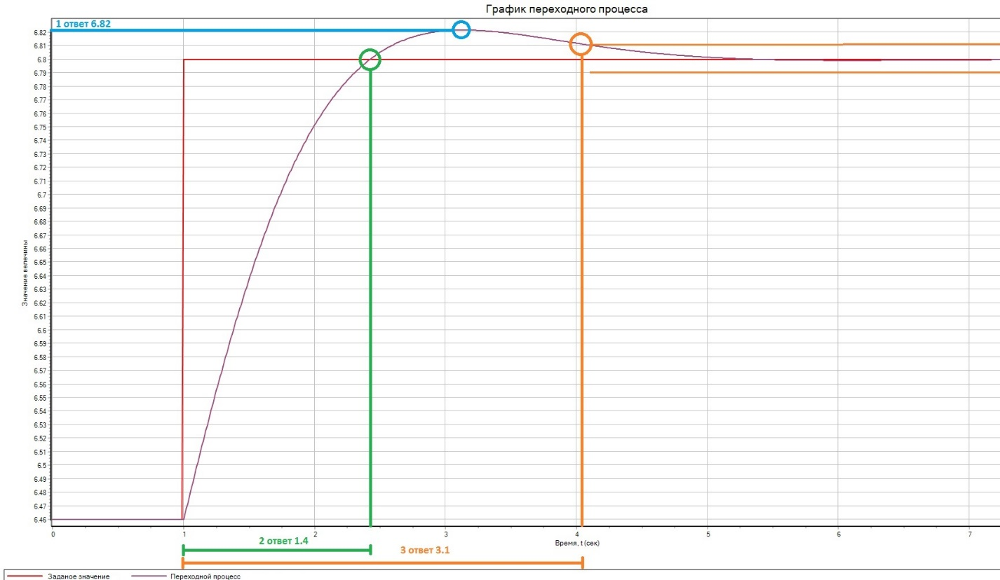 В ответе укажите максимальное значение давления (с точностью до 0,01 МПа), полученное в процессе регулирования, определите, через какое время (с точностью до 0,1 с) после изменения задания оператором давление в ГПК достигнет впервые номинального значения 6,8 МПа, а также найдите, через какое время значение вернется в трубку установившегося номинального значения 6,8 \(\pm\) 0,01 МПа.
