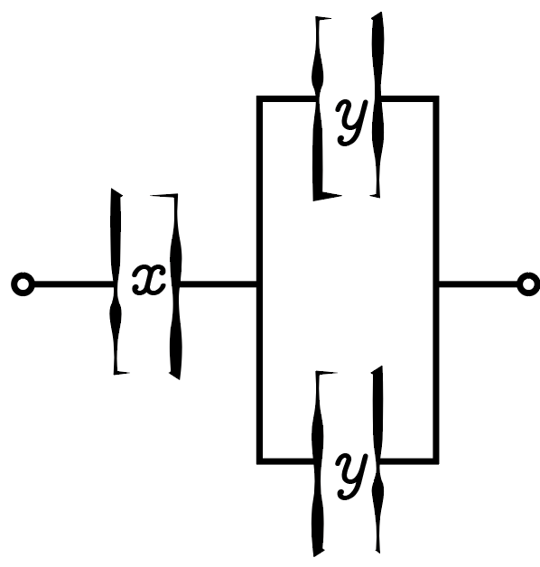 Реостаты на схеме соединены параллельно, поэтому общее сопротивление схемы \(R\) может быть выражено через сопротивления \(R_{1{,}2}\) каждого из реостатов по формуле \[R = \frac{R_1 R_2}{R_1 + R_2}. \label{resistance}\]