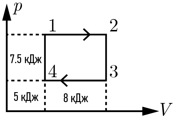 Первая — есть площадь прямоугольника \(1234\). Найти ее просто, если заметить, что поскольку высота (вдоль оси \(p\)) у верхних двух прямоугольников одинакова, их площади относятся так же, как и их ширины (вдоль оси \(V\)), и то же верно для нижней пары прямоугольников \[A = 7{,}5\frac{8}{5} = 12\textrm{\,кДж}.\]