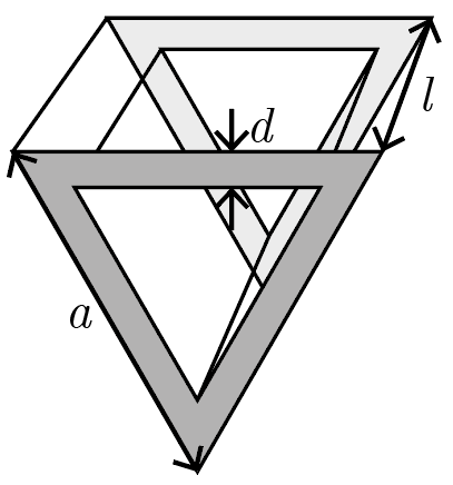Трюм грузового судна представляет собой призму с основанием в виде равностороннего треугольника вершиной вниз. Длина внешней стороны треугольника \(a = 15\textrm{\,м}\), толщина его стенок \(d = 1{,}5\textrm{\,м}\), длина киля судна (высота призмы) \(l = 40\textrm{\,м}\). Инженерами было рассчитано, что для сохранения устойчивости судна центр тяжести сыпучего груза, перевозимого в трюме, должен быть хотя бы на \(h = 2\textrm{\,м}\) ниже центра тяжести вытесняемой трюмом воды при его полном погружении. Какой максимальный объем груза можно разместить в трюме, если при насыпании его центр тяжести занимает самое низкое доступное положение?