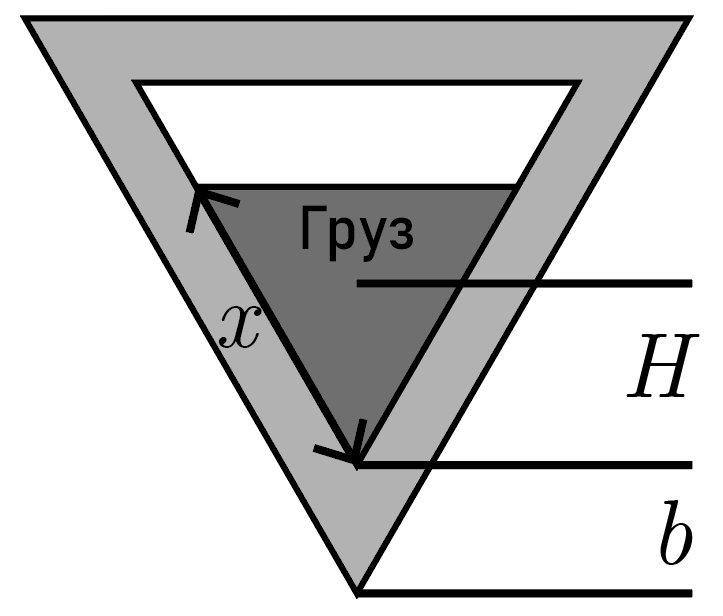 Высота \(y_\textrm{г}\) центра тяжести груза может быть найдена как \[y_\textrm{г} = b + H,\] где \(b\) — толщина стенки вдоль соответствующего направления (см. рис. 6.5), а \(H\) — высота центра тяжести груза от нижней внутренней точки трюма. Обе эти величины вычисляются из тригонометрии \[b = 2d; \quad H = \frac{\sqrt{3}}{3}x,\] где \(x\) — сторона треугольника, являющегося поперечным сечением груза.
