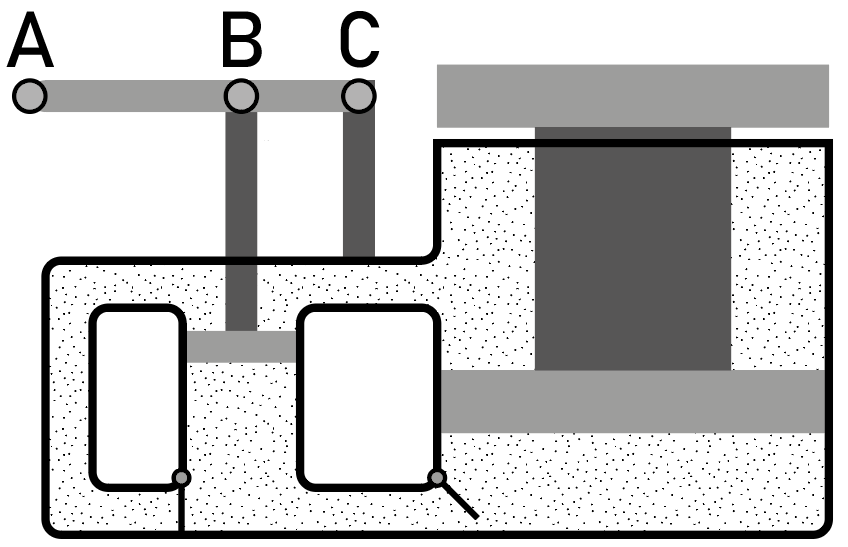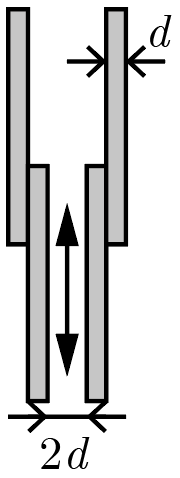 Рассматриваемый конденсатор может быть представлен как батарея из двух параллельно соединенных конденсаторов, один из которых (внутренняя пара пластин) всегда имеет зазор \(2d\) и площадь обкладок \(S\), а другой (внешняя пара) имеет зазор \(4d\) и площадь обкладок, которая может изменяться в пределах от \(0\) до \(S\). Поскольку эти конденсаторы соединены параллельно, эквивалентная емкость батареи равна сумме их емкостей, а значит, максимальна, когда пары пластин максимально раздвинуты и минимальна, когда они полностью вдвинуты одна в другую. Используя формулу емкости плоского конденсатора, найдем, что емкость внутренней пары пластин (она же минимальная емкость всей батареи) равна \[C_1 = \frac{S \varepsilon_0}{2d},\] где \(\varepsilon_0\) — диэлектрическая постоянная.
