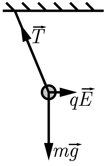 На шарик действуют три силы: горизонтально направленная сила электростатического взаимодействия \(q\vec{E}\), вертикально вниз направленная сила тяжести \(m\vec{g}\) и направленная вдоль нити сила ее натяжения \(\vec{T}\). Разумеется, маятник может быть в равновесии, только если векторная сумма этих сил равна нулю, то есть эти три вектора образуют замкнутый треугольник \[q\vec{E} + m\vec{g} + \vec{T} = \vec{0}.\]