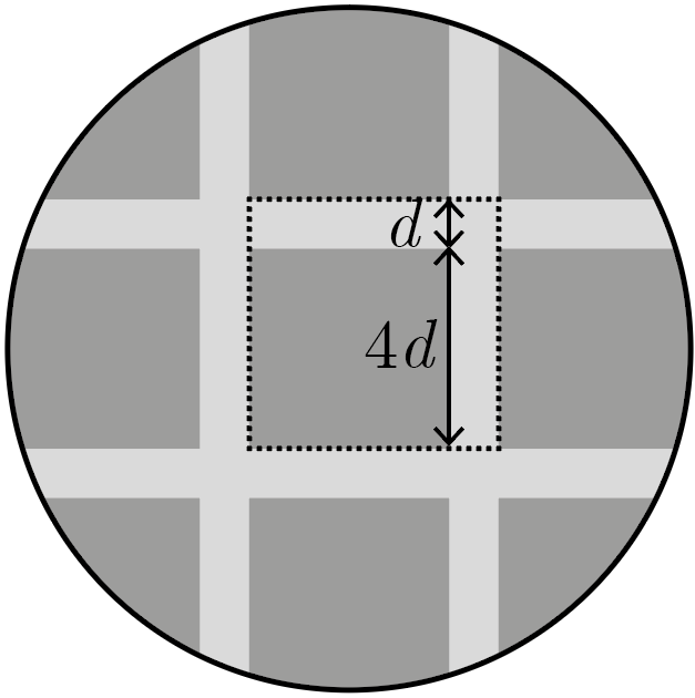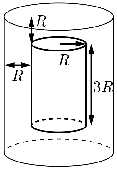 Объем области, заполняемой теплоизоляцией, удобнее всего найти, вычтя из объема \(V_1\) большого внешнего стакана объем \(V_2\) маленького внутреннего. Для любого кругового цилиндра с высотой \(h\) и радиусом \(r\) объем может быть найден по формуле \(V = \pi r^2 h\). В случае большого цилиндра \(r = 2R\) и \(h = 5R\), следовательно, \[V_1 = 5R \cdot \pi (2R)^2 = 20 \pi R^3. \label{volume1}\]