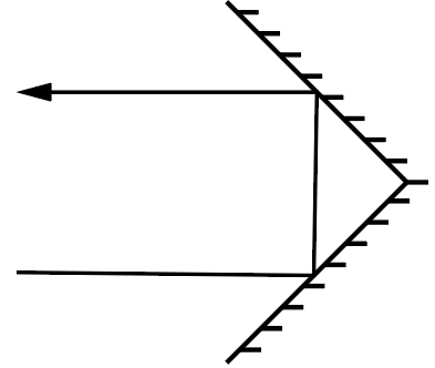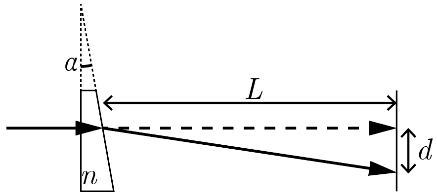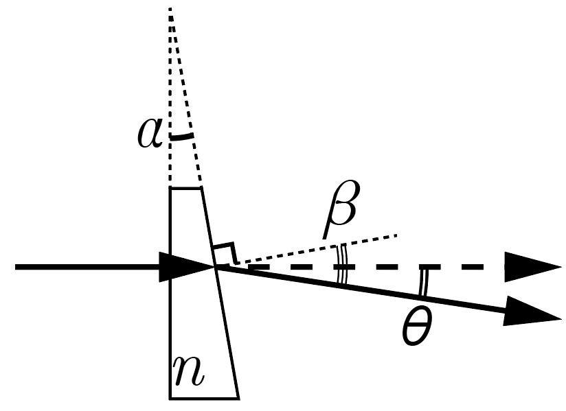 На первой по ходу распространения луча грани призмы свет не преломляется, поскольку падает на нее под прямым углом. Следовательно, угол падения луча на переднюю грань призмы равен \(\alpha\). Тогда по закону Снеллиуса \[n = \frac{\sin \beta}{\sin \alpha},\] где \(\beta\) — угол преломления луча, что с учетом приближения малых углов \(\sin \alpha \approx \alpha \approx \operatorname{tg} \alpha\) (в радианах) принимает форму \[n \approx \frac{\beta} {\alpha}.\]