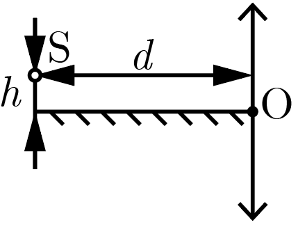 Тонкая собирающая линза имеет фокусное расстояние \(F = 20\textrm{\,см}\). Вдоль ее оптической оси перед линзой расположено плоское зеркало, на расстоянии \(h = 2\textrm{\,см}\) от которого и \(d = 60\textrm{\,см}\) от линзы размещен светодиод \(S\) (рис. 2.1). Найдите расстояние между двумя действительными изображениями светодиода, формируемыми этой оптической системой.