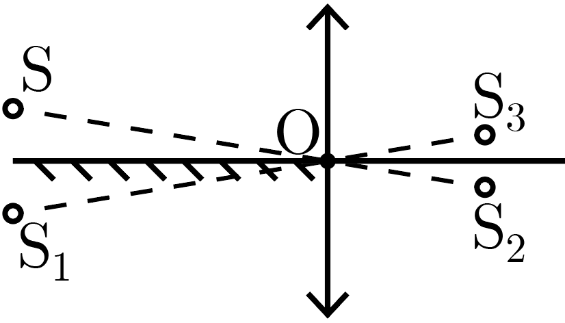Зеркало формирует мнимое изображение \(S_1\) источника, расположенное в противоположном от него полупространстве на таком же расстоянии от зеркала, как и сам источник. В силу перпендикулярности зеркала и линзы, это мнимое изображение также окажется на расстоянии \(d\) от плоскости линзы. Далее линза формирует два действительных изображения: одно непосредственно от источника \(S\) (на рис. 2.2 оно обозначено \(S_2\)) и другое — от его мнимого изображения \(S_1\) (\(S_3\) на рисунке).