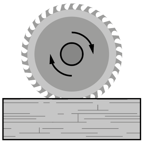 При вращении пилы диссипативные силы (трения различных типов) переводят механическую энергию пильного диска в тепловую. При этом количество выделяющегося тепла равно по модулю работе \(A\) этих сил. Последнюю легко найти из ее определения \[A = FS = Fvt, \label{work}\] где \(S\) — путь точек соприкосновения диска с заготовкой, \(v\) — скорость этих точек. При вращении диска скорость точек его кромки удобно выразить через период вращения \(T\) этого диска \[v = \frac{\pi D}{T} = \pi D \nu, \label{velocity}\] где \(\nu\) — частота вращения диска в оборотах в секунду. Подставляя \eqref{velocity} в \eqref{work} и учитывая \(Q = A\), получим окончательно \[Q = \pi F D \nu t \Rightarrow F = \frac{Q}{\pi D \nu t} \approx 37\textrm{\,Н.}\]