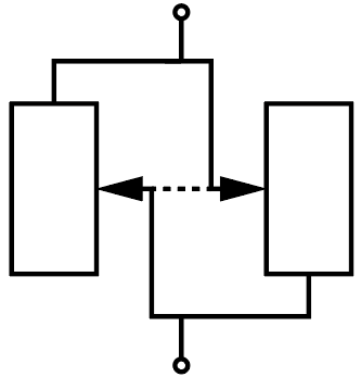 Два абсолютно одинаковых ползунковых реостата, сопротивления которых могут изменяться в пределах от \(0\) до \(R_0 = 2\textrm{\,кОм}\), размещены параллельно на печатной плате и соединены как изображено на рис. 2.4. Из-за ошибки в процессе пайки изоляция их ползунков слиплась таким образом, что ползунки всегда занимают одно и то же положение на обоих реостатах, но электрический контакт между ними отсутствует (это соединение обозначено на рисунке пунктиром). Найдите разницу между максимальным и минимальным сопротивлениями полученной батареи.