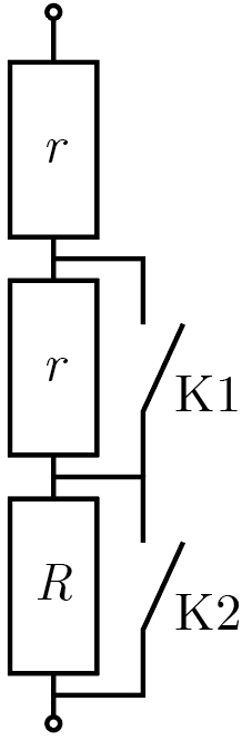 Когда параллельно резистору коротко замыкается цепь, этот резистор фактически перестает работать, поскольку сопротивление провода пренебрежимо мало. Следовательно, замыкание ключа К1 фактически эквивалентно замене среднего резистора на отрезок провода, а ключа К2 — такой же замене нижнего. Учитывая это и применяя формулу эквивалентного сопротивления последовательно соединенных резисторов, легко получим \[\left\{ \begin{aligned} &R_1 = r + R, \\ &R_2 = 2r. \end{aligned} \right.\]