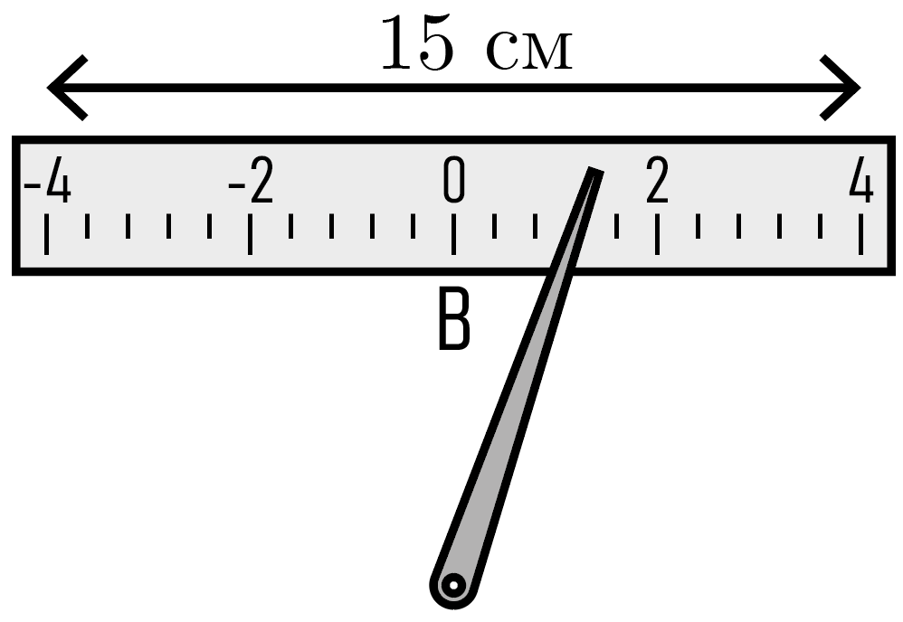 Шкала вольтметра, используемого в эксперименте, имеет вид, представленный на рис. 3.2, и общую длину \(l = 15\) см (от минимальной до максимальной отметки). Экспериментатор, глядя на прибор под углом \(45°\) к плоскости шкалы, считал показания вольтметра как \(U_1 = 1{,}2\) В ровно, однако на самом деле стрелка прибора находилась напротив отметки \(U_2 = 0{,}8\) В. Определите, на какое расстояние отстоит стрелка от шкалы, если известно, что глаза экспериментатора находились со шкалой строго на одном уровне высоты, а деления расположены на шкале равномерно.