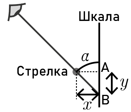 Согласно условиям, глаза экспериментатора находятся на одной высоте со шкалой, поэтому удобно изобразить систему в горизонтальной плоскости (вид сверху), см. рис. 3.3. Поскольку угол \(\alpha\), под которым наблюдатель смотрит на стрелку, равен \(45°\), искомое расстояние \(x\) в точности равно расстоянию \(y\) между точкой \(A\) действительных показаний прибора и точкой \(B\) считанных экспериментатором показаний (треугольник \(ABC\), где \(C\) — стрелка — прямоугольный и равнобедренный).